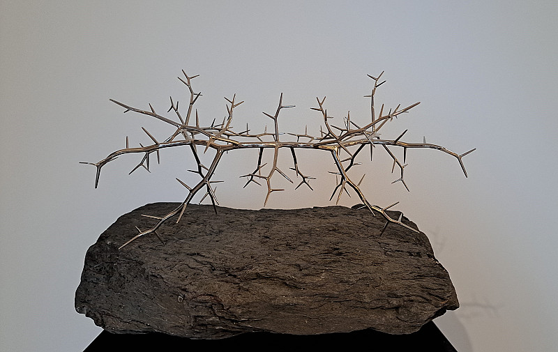 A crown of thorns is a symbol we all know well but the story it evokes may become diluted with familiarity. The intention to make the crown, which is a violent and cruel device, beautiful, is to toy with the emotion of the viewer. A holy symbol of material sacrifice becomes an elegant trap of material temptation.
