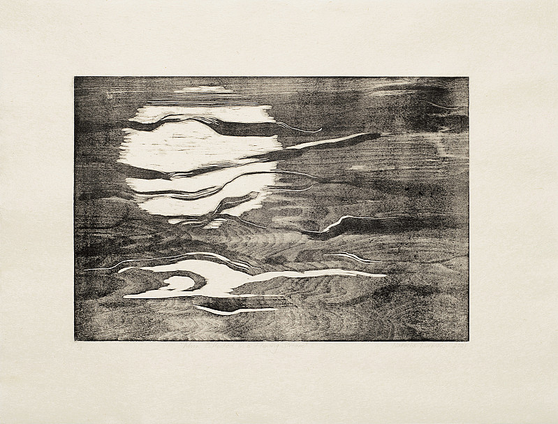 Indulging in the long gloom that characterises a winter moonrise, this print combines a lithographic and woodcut technique to evoke the beauty of the moon reflected in running water.