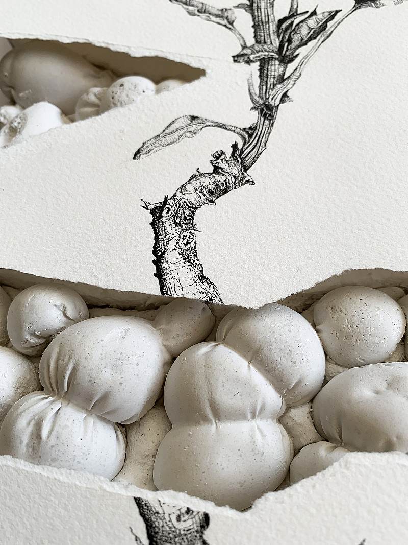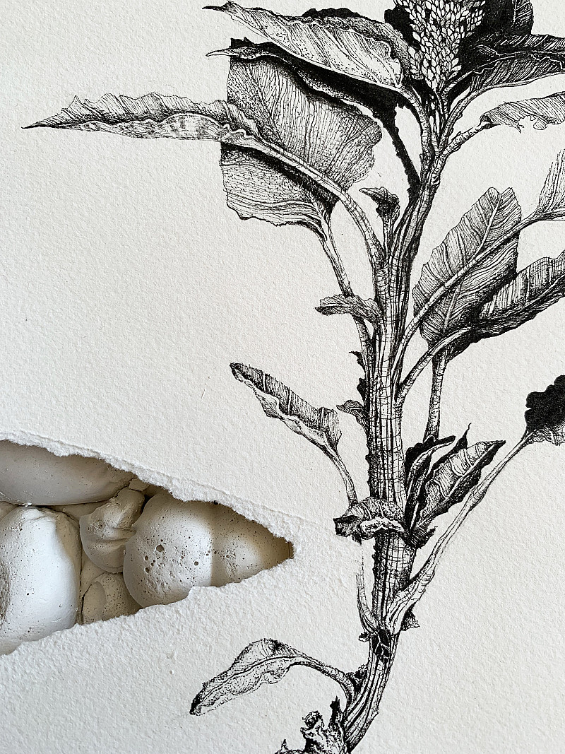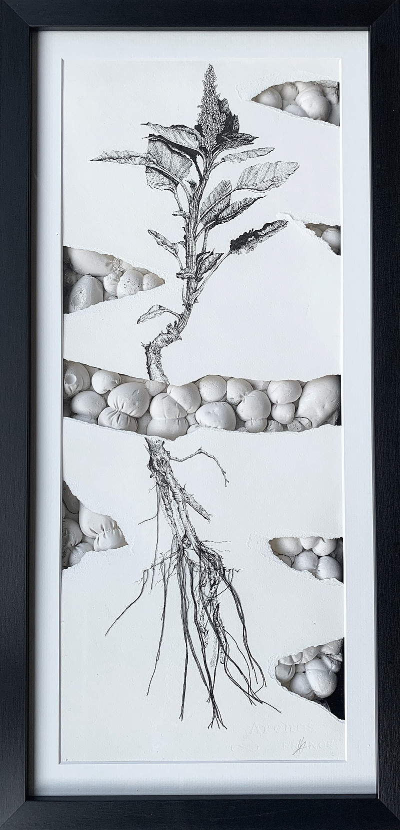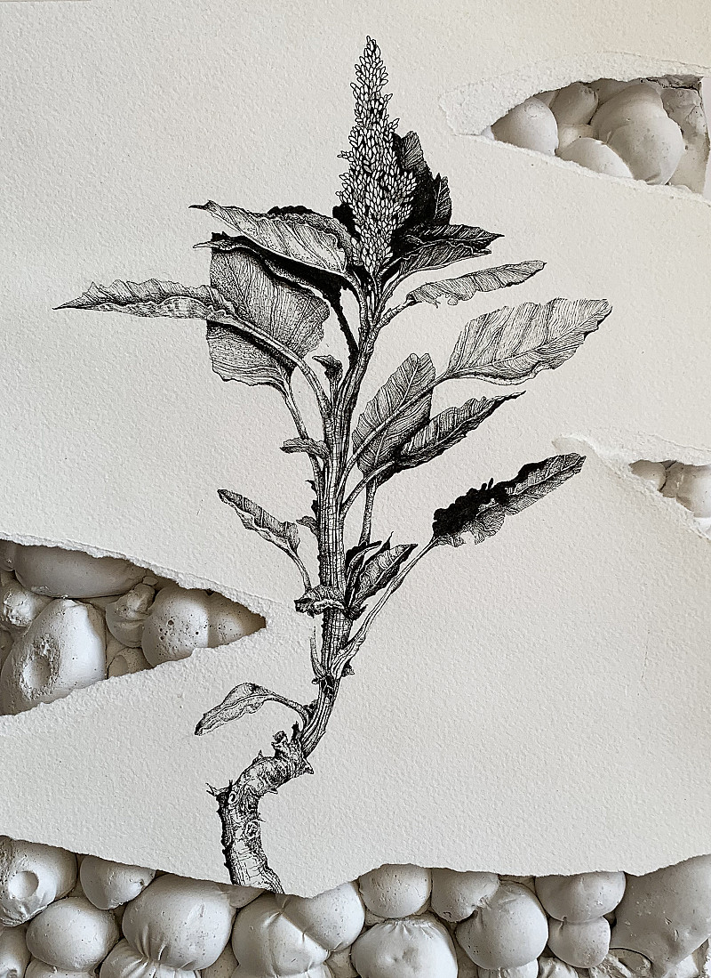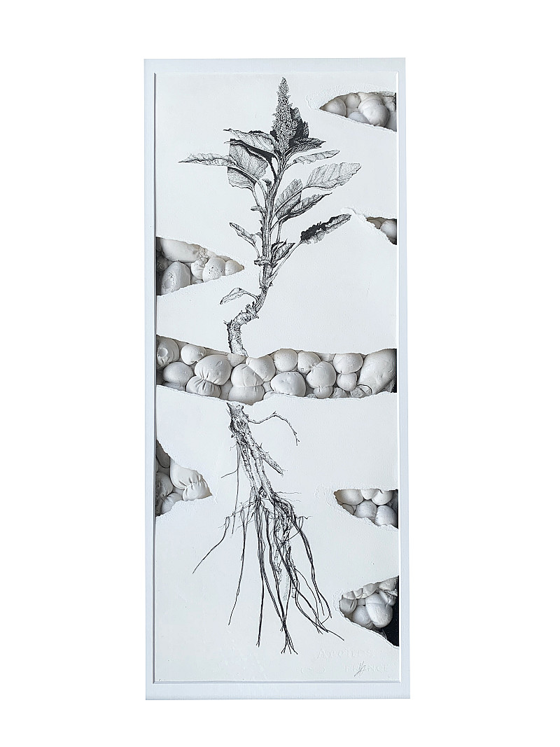 “Unwanted, yet flourishing. An unwelcome guest that appears in the harshest of environments placing pressure and strain on an already drained environment. Polygonum aviculare or the commonly known Knotgrass weed acts as a metaphor for the points of pressure we all hit in our lifetimes. It is here where we are united- with none spared. A singular or series of events that send us spiralling down into our own depts finally emerging as our new selves- for better or for worse. We all have unwanted weeds that spring up testing our beliefs, our strength, highlighting our weaknesses or exposing our true selves- and it is only through these pressures that we emerge as survivors, older but wiser. Whether underserved or "part of a bigger plan" these weeds co-exist with us-and all we are left to do is pluck or hang on. The weeds destructive nature is emphasised by the torn paper and the harsh plaster stones cut and formed under pressure while the thread emphasises the living and growing weed.”
