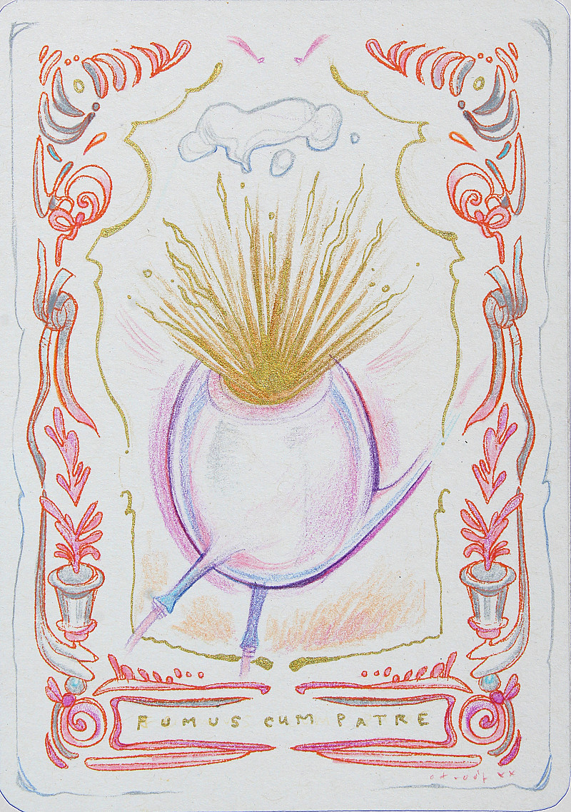 Que le Père fume avec vous (May the Father smoke with you) (Prayers to swallow Series), Octavia Roodt , Screen print on Stephen 370GSM paper, colour pencil and gold ink