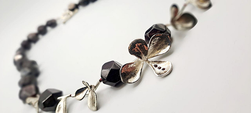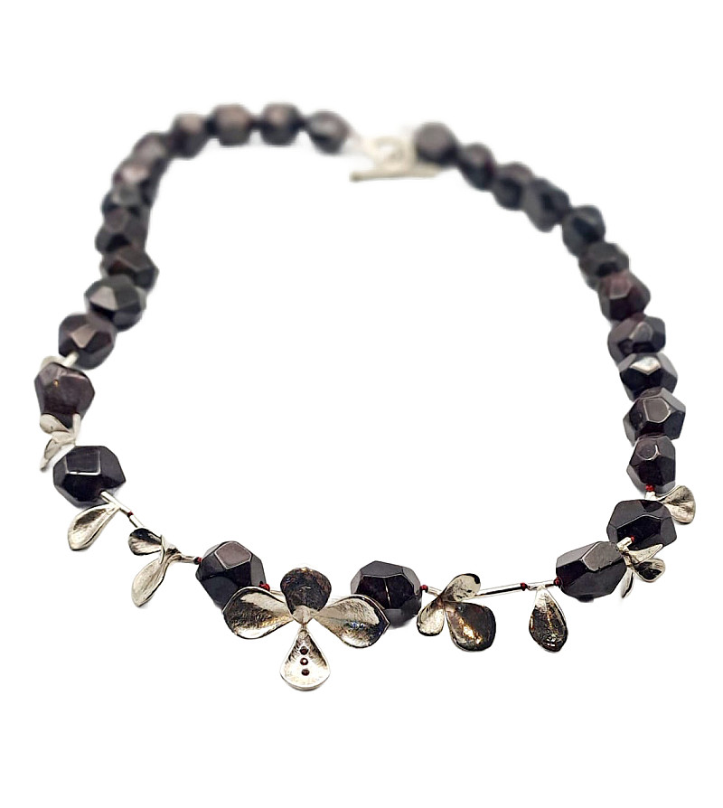 Almandine Garnet beads, hand strung on Silk, decorated with Sterling Silver (Rhodium plated) individually cast Spekboom leaves and a hand made clasp. Focal leaf set with Rhodalite Garnet round brilliant cut faceted beads.