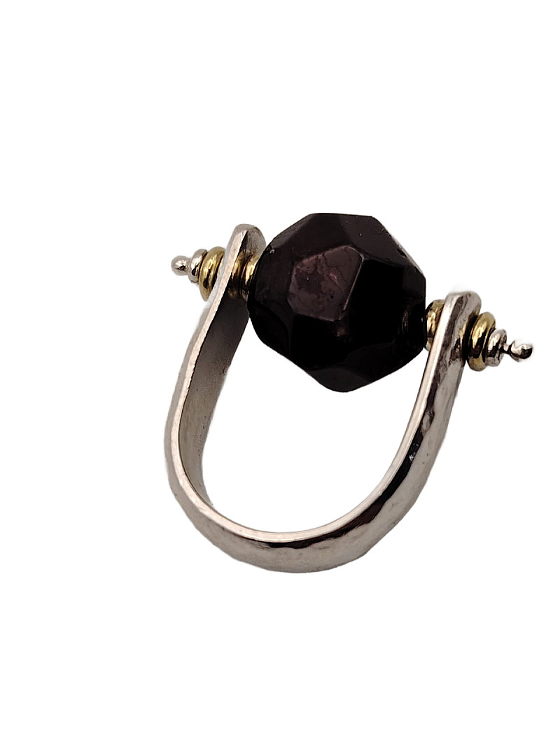 Adamine Garnet bead set in 990 Silver and decorated with 18ct Yellow Gold finger ring.